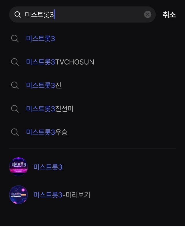 3. 검색창에 미스트롯3 을 검색해 주세요. (아래 이미지 참고)